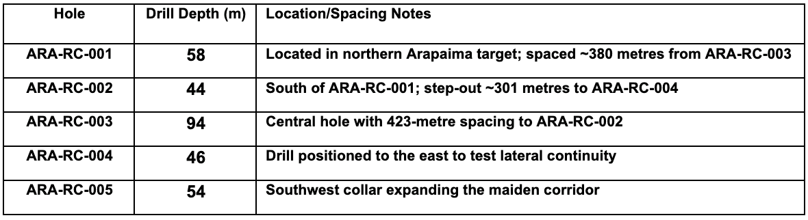 Table 1: Summary of maiden RC drill holes completed at the Arapaima Project, including hole depth and relative spacing information.