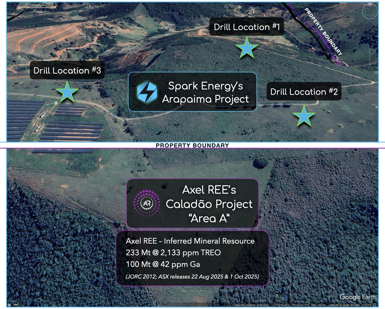 Figure 1. Planned Spark drill locations situated immediately north of Axel REE's Caladão Project "Area A," where Axel has reported a JORC 2012 Inferred Mineral Resource of 233 Mt @ 2,133 ppm TREO and 100 Mt @ 42 ppm gallium. Spark's maiden RC program is designed to test whether this REE-gallium system extends southward onto the Arapaima Project.