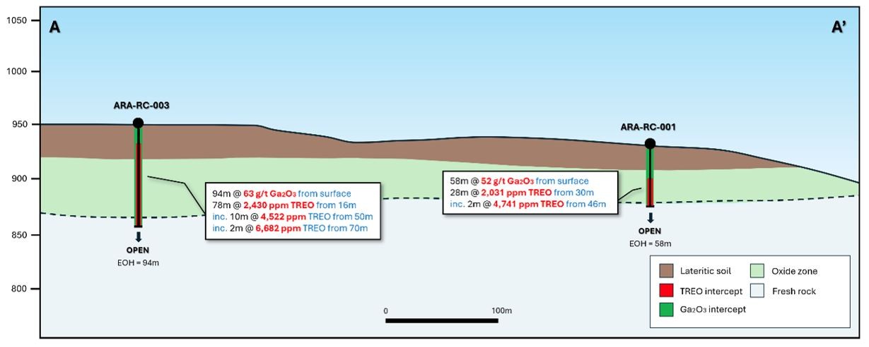 Figure 2: Cross-section A-A' highlighting the mineralized intercepts in holes ARA-RC-001 and -003.